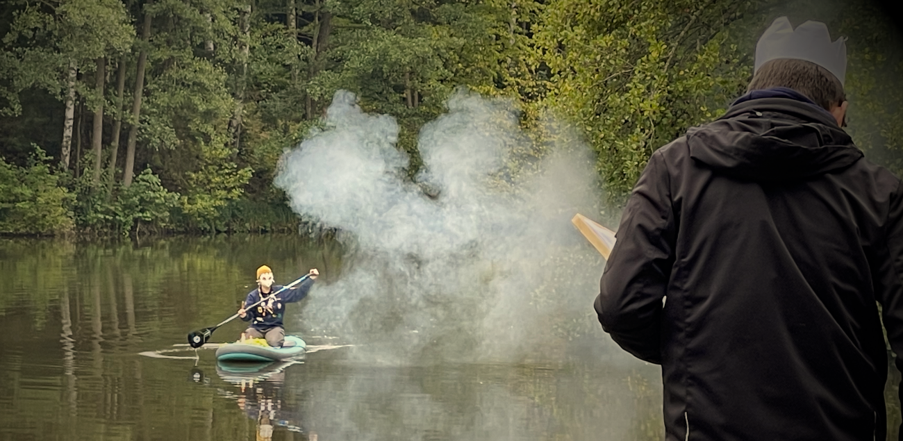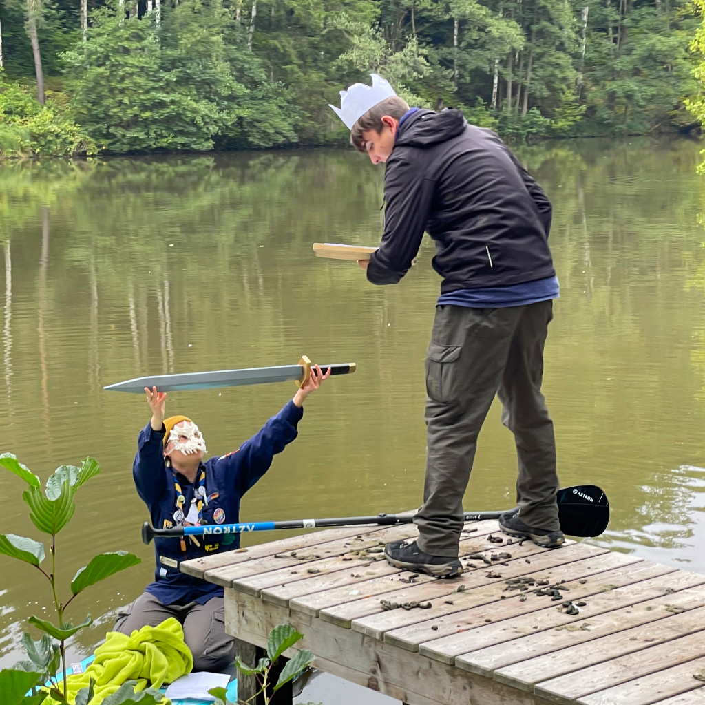 Sonntag: Die Runen führten zum See. Die Pfadis bauten ein Portal (Minecraft-Style), die Herrin des Sees erschien im Nebel und stellte eine Quizfrage. Artus bestand und bekam Excalibur.